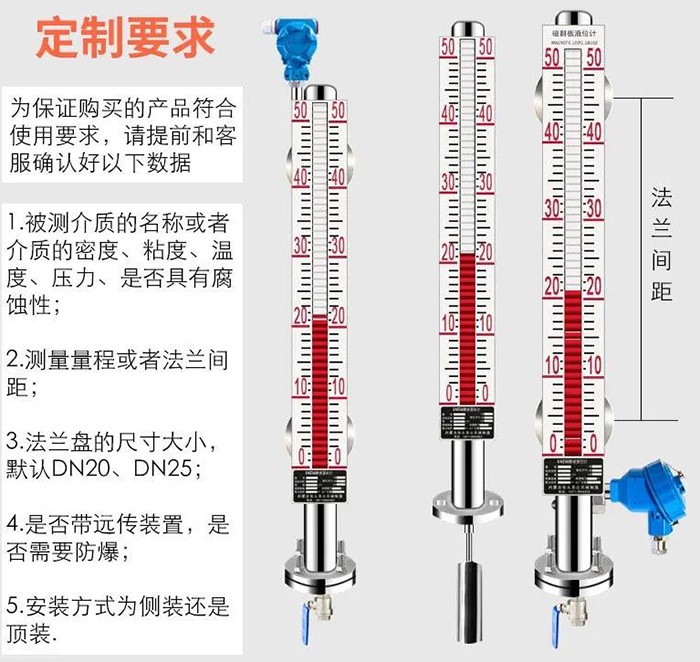 選擇磁翻柱液位計時,知道要測量的介質及為關鍵,像低溫,高溫,腐蝕都是磁翻板致命的因素,如果不清楚介質就隨意選用,不僅會對測量精度有所誤差,也會直接影響磁翻板的使用壽命;又或者是直接無法使用工況的測量。